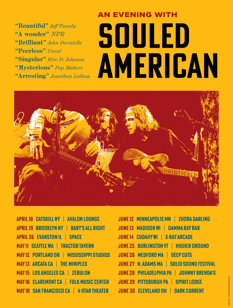 The band Souled American was a creature of Chicago’s heady music ecosystem of the late ’80s and early ’90s, releasing half a dozen albums between 1988 and 1995, each one capturing a sluggish and deeply secretive beauty. Although occasionally celebrated in the alt-country realm, the band was ultimately one of those genre-of-one entities: It subsisted outside the boundaries, doomed to flourish for the benefit of the few. Yet this band has a weird habit of wiggling out of hibernation. Perhaps its strangest turn of events came back in 1997, when the music novelist Camden Joy launched “Fifty Posters About Souled American.” Herein, a posse of enthusiasts (among them Jonathan Lethem and Richard Gehr) obliquely raved of Souled American’s music on posters that were pasted, guerilla-fashion, on the unsuspecting streets of New York.
